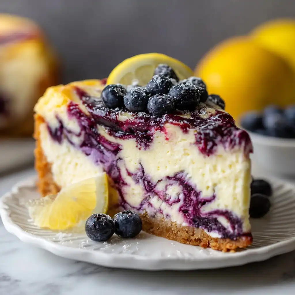This Lemon Blueberry Swirl Cheesecake is a masterclass in balance—where the sun-kissed zing of fresh lemon and the deep, jammy sweetness of slow-simmered blueberries dance across a foundation of luxuriously creamy, crack-free New York style cheesecake, all anchored by a buttery, spiced graham cracker crust.
